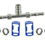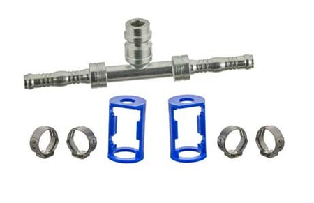 #8 Inline Splicer w/R-134a port for Reduced Barrier Hose. Includes the two cages and four clips. BurgaClip Part Number BC-8751-08-08, MEI Airsource Part Number 4579BC