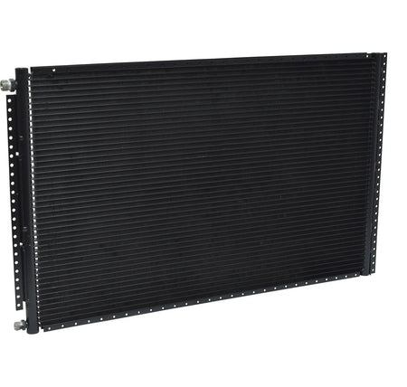 This is an aluminum parallel flow condenser. There are mounting holes along the top, bottom and on each end. We have a set of universal condenser brackets for purchase to mount this style of condenser P/N CS1000 Overall Condenser size: 18 3/4" tall by 31 1/8" wide Core Size: 18 3/4" tall by 29 1/2" wide Thickness: 7/8" The condenser has two male insert oring fittings. The top discharge fitting is # 8 (3/4") Male insert oring and the bottom Liquid fitting is # 6 (5/8"). The condenser fittings will accept female oring fittings.