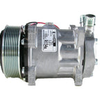 This is a genuine New Sanden SD7H15 a/c compressor. A SD7H15 compressor has seven cylinders in comparison to the SD508, SD510 and SD5H14 compressors which only had five cylinders. This compressor has a cubic inch displacement of 9.5 (155CC). This compressor can be used for R12 and R134a and ships full of oil. This is a Sanden model number 4711. The compressor has an eight groove clutch assembly with a pulley diameter of 119mm. The compressor rear head has standard oring fittings: discharge fitting #8 (3/4" - 16 thread) and suction fitting # 10 (7/8" - 14 thread).