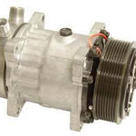 New Sanden style SD7H15 a/c compressor. A SD7H15 compressor has seven cylinders in comparison to the SD508, SD510 and SD5H14 compressors which only had five cylinders. This compressor has a cubic inch displacement of 9.5 (155CC). This compressor can be used for R12 and R134a and ships full of oil. This is generic Chinese manufactured compressor which is equivalent to Sanden model number 4711. The compressor has an eight groove clutch assembly with a pulley diameter of 119mm. The compressor rear head has standard oring fittings: discharge fitting #8 (3/4" - 16 thread) and suction fitting # 10 (7/8" - 14 thread).