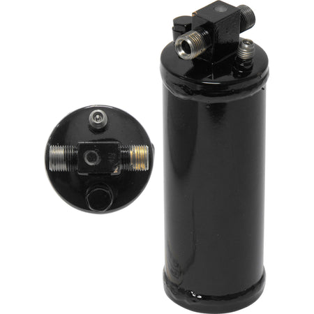 Universal Receiver Drier. Has #6 3/8" Male O-ring Inlet and Outlet fittings. The diameter of the drier is approximately 2.5" and the height is 8". The drier has a female 3/8"-24 and male 1/4" switch port.