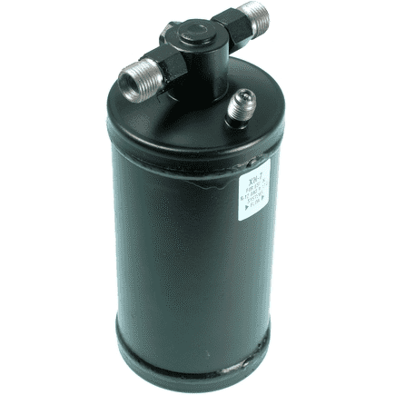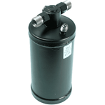 Universal Receiver Drier. Has #6 3/8" Male O-ring Inlet and Outlet fittings. The diameter of the drier is 3" and the height is 7.50". The drier has a male 7/16" switch...